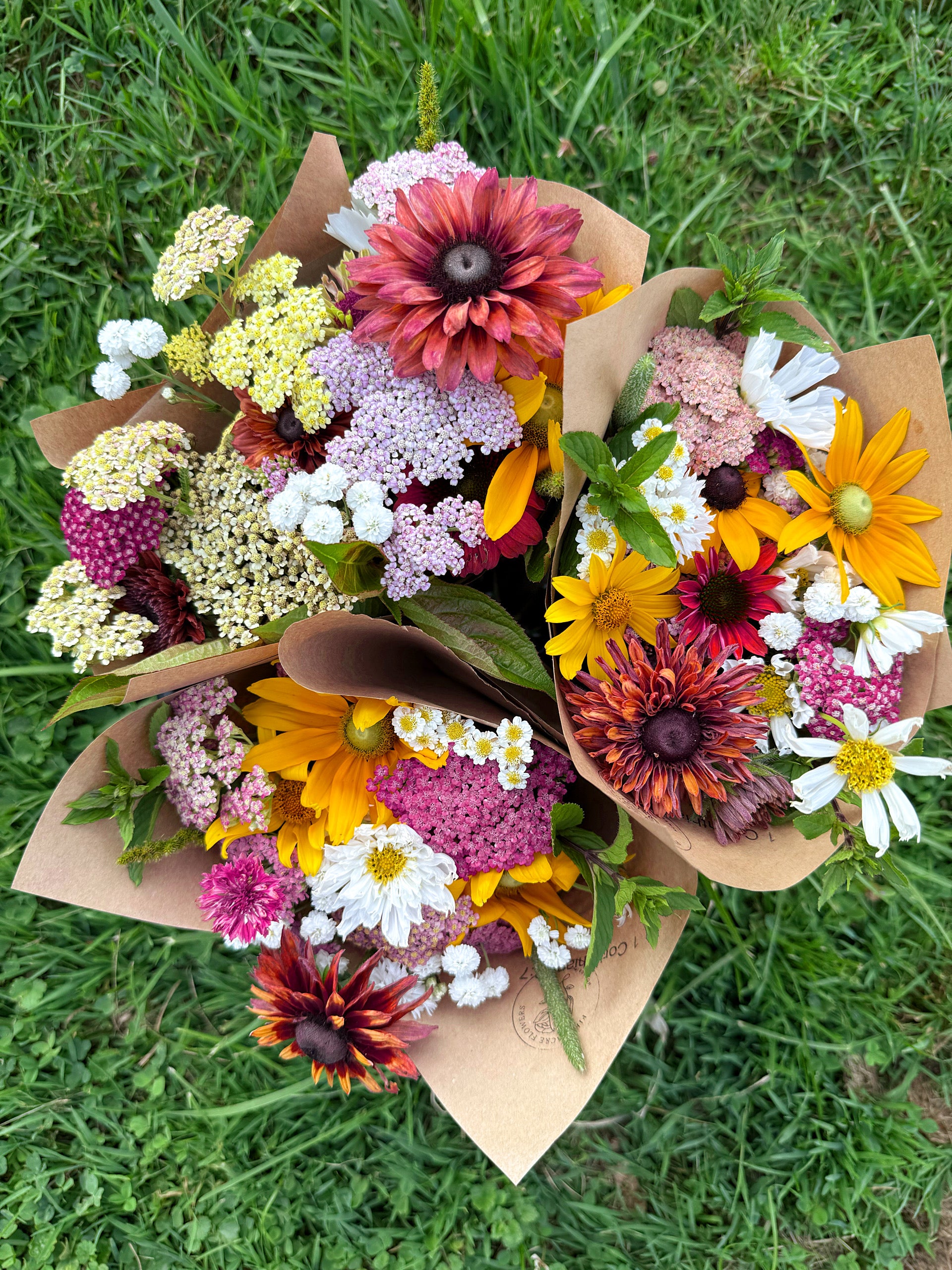A market style wrapped bouquet of fresh, seasonal blooms grown here on our farm. Thank you for using our self-serve flower stand.